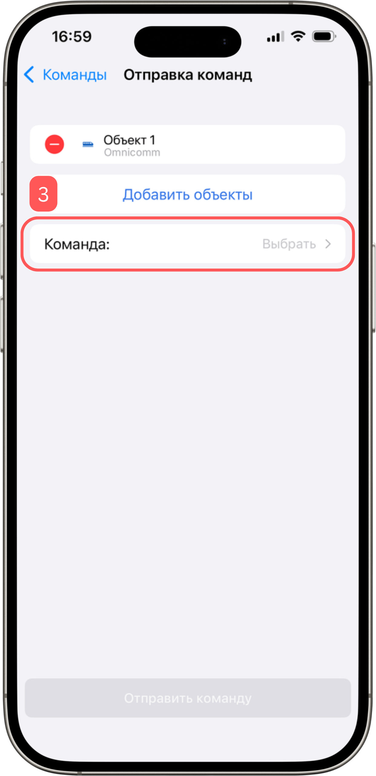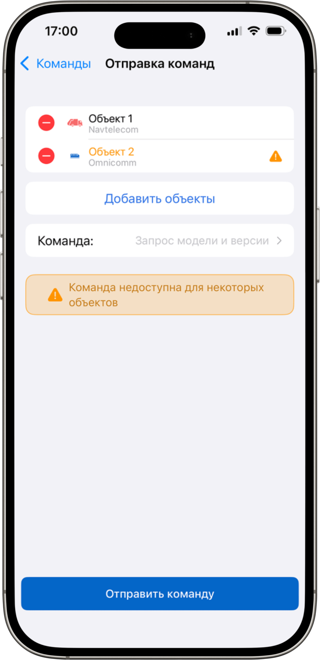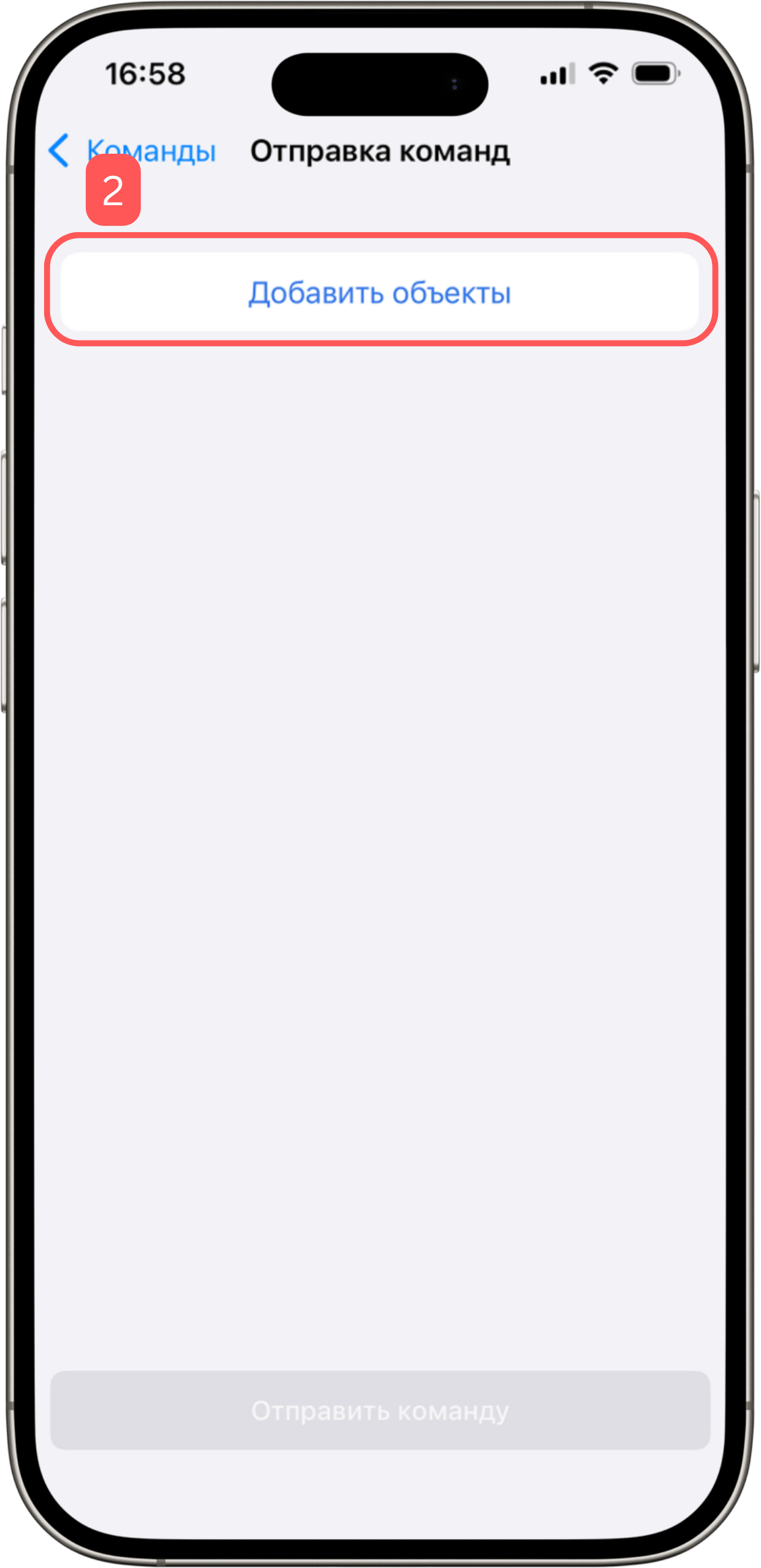 - Нажмите «Добавить объекты», чтобы выбрать объекты, на которые хотите отправить команду.