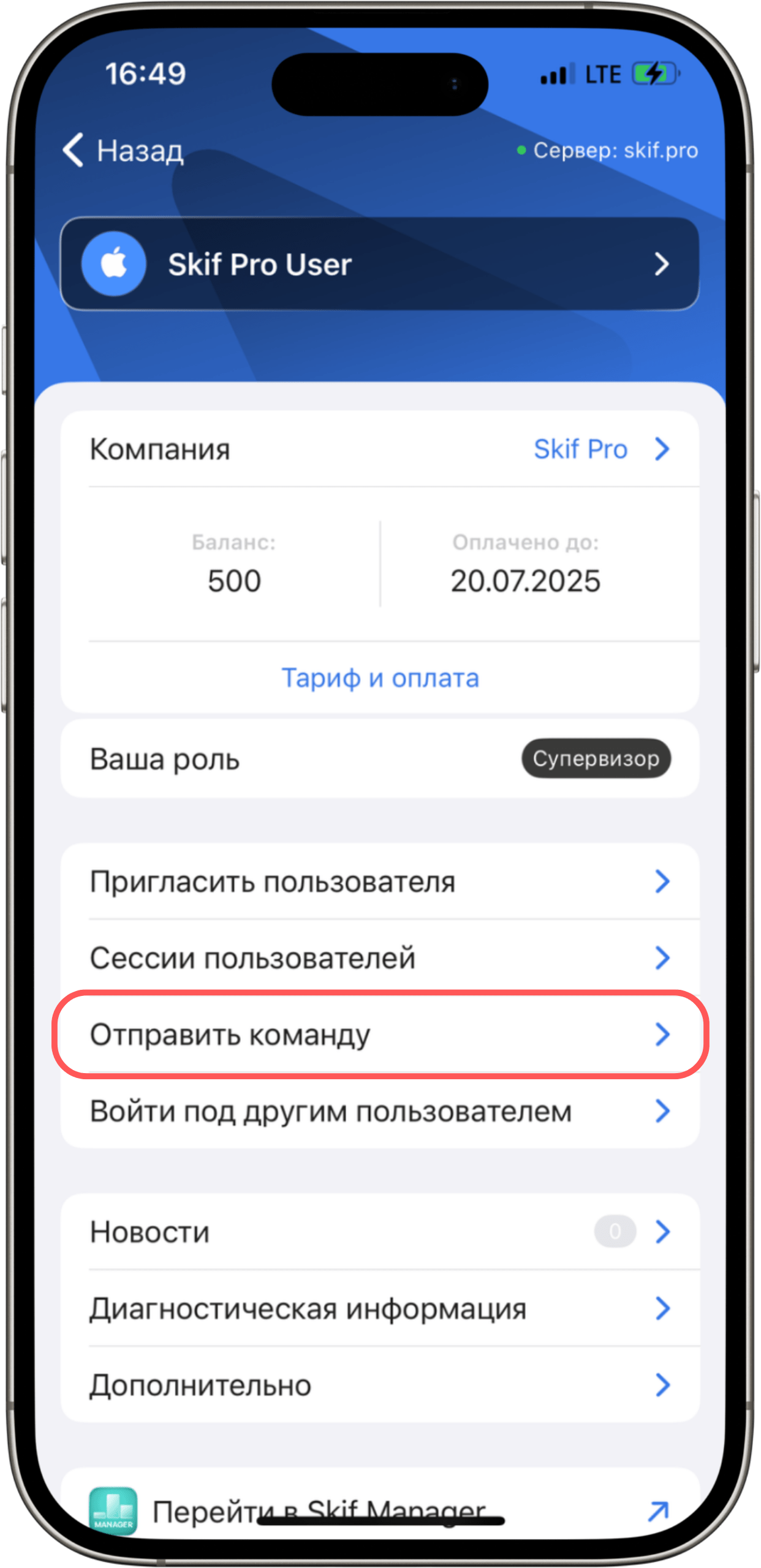- Выберите пункт «Отправить команду».