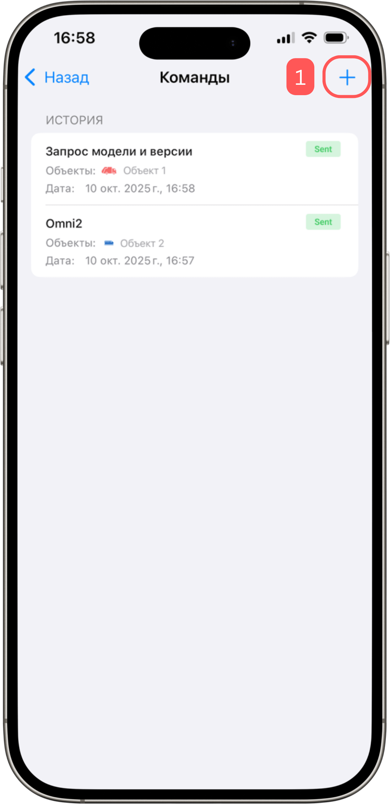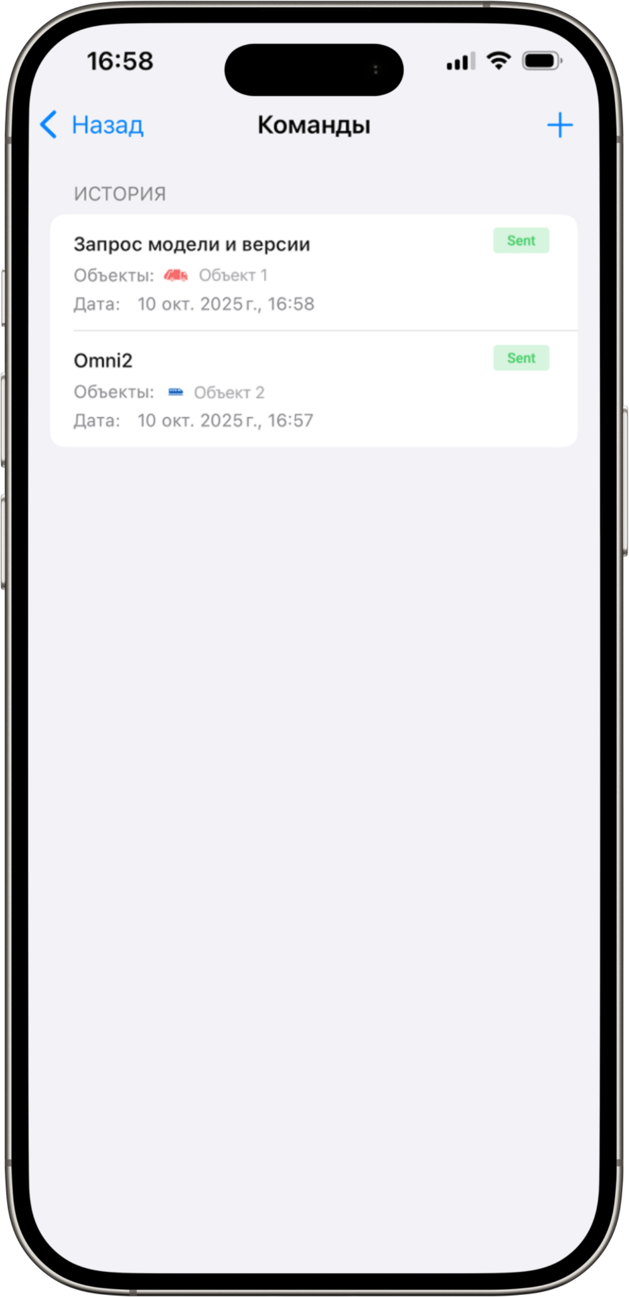 Экран истории отображает все ранее отправленные команды. Для каждой команды показываются: