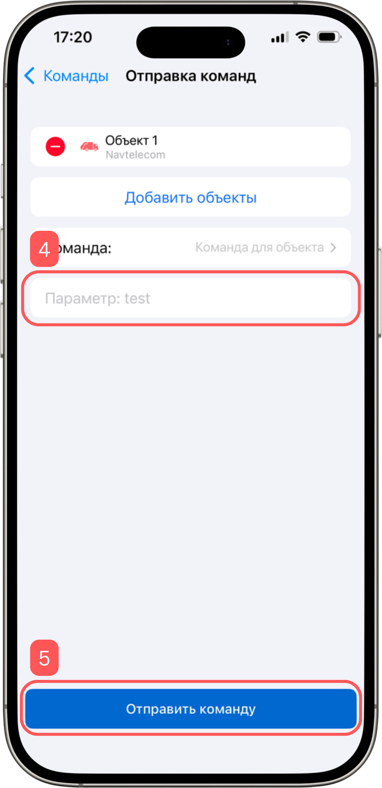 Функция «Отправка команд» позволяет отправлять команды на один или несколько терминалов из мобильного приложения.